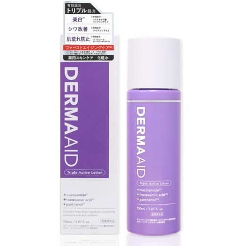 ダーマエイド化粧水(ダーマエイド トリプルアクティブローション)は、「ナイアシンアミド」「トラネキサム酸」「D-パントテニルアルコール(パンテノール)」という3つの有効成分を配合した医薬部外品です。これらの成分が、シミ予防、シワ改善、肌荒れ防止といった複数の肌悩みに同時にアプローチします。ナイアシンアミドはシワ改善や美白効果が期待でき、トラネキサム酸はメラニンの生成を抑えてシミ・そばかすを防ぎます。D-パントテニルアルコールは肌荒れを防ぎ、健やかな肌へと導く成分です。これらの成分が複合的に作用することで、肌の悩みを総合的にケアできるのが、ダーマエイド化粧水の大きな魅力と言えるでしょう。