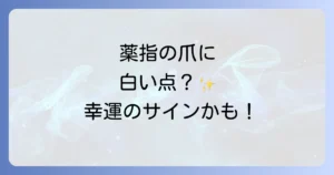 ふと自分の爪を見たとき、白い点を見つけて驚いた経験はありませんか? 特に薬指に現れた白い点は、単なる体の変化ではなく、スピリチュアルなメッセージが込められているとされています。もしかしたら、それはあなたに訪れる幸運のサインかもしれません。本記事では、薬指の爪に現れる白い点のスピリチュアルな意味を深く掘り下げ、他の指の白い点が示すメッセージや、医学的な観点からの情報、そして幸運を引き寄せるための具体的な方法まで、幅広く解説します。あなたの爪に現れた小さな白い点が、素晴らしい未来への道しるべとなるよう、一緒にその意味を探っていきましょう。